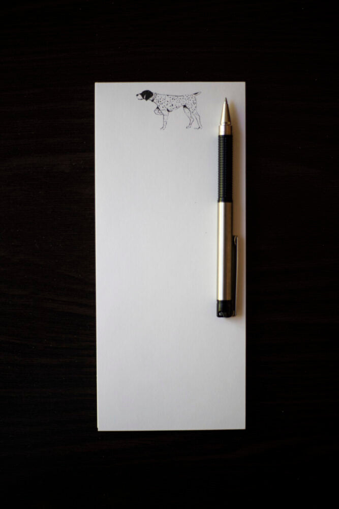 Ancesserie's German Short Haired Pointer now in a long note pad! Original artwork for Ancesserie. A retro elegance adds to the fun in their note pad collection. Nice little surcie. Great to have on hand! 65 sheet pads of 70 lb paper. Long and slender with lots of room for your list. Measures 8 1/2″ x 3 5/8″ each.
