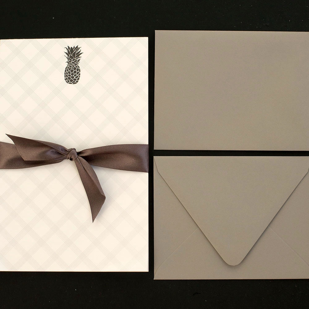 This set features a custom pineapple motif and just a hint of Tartan plaid as a backdrop to your words. 25 letter-sheet tablet of 70#, superfine, smooth paper stock measuring 8.5_ x 5.5_ & tied with double-faced, satin, gravel-gray ribbon. 10 matching gray envelopes included. Presented in a smart, crystal, clear box.
