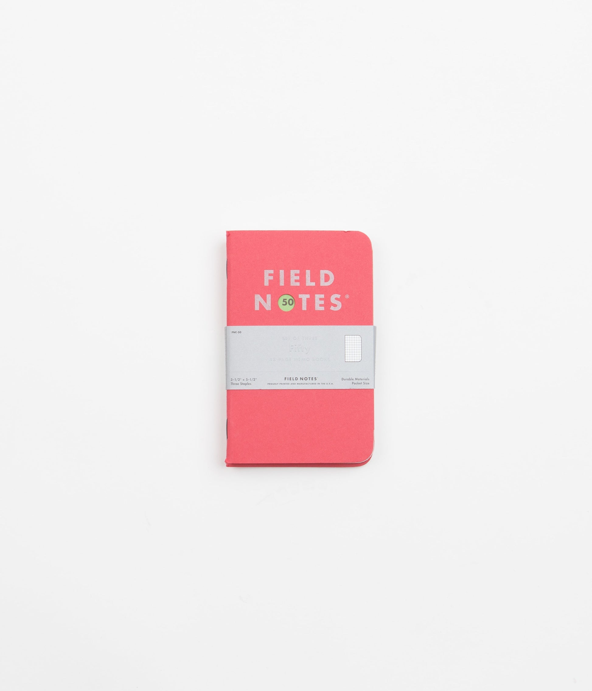 Field Notes Fifty Memo Books 3 Pack in Graph Paper. Arriving as a commemoration of its forty-nine preceding versions, this three pack of Field Notes memo books has been crafted in the USA to feature ‘Red Hot’ French Paper Co. covers with embossed ‘Liberty Silver’ covers. Styled with three different flyleaf covers inspired by different Quarterly Editions, these 48-page Field Notes memo books are finished with silver dot-graph pages, die-cut detailing and with rounded cover corners.