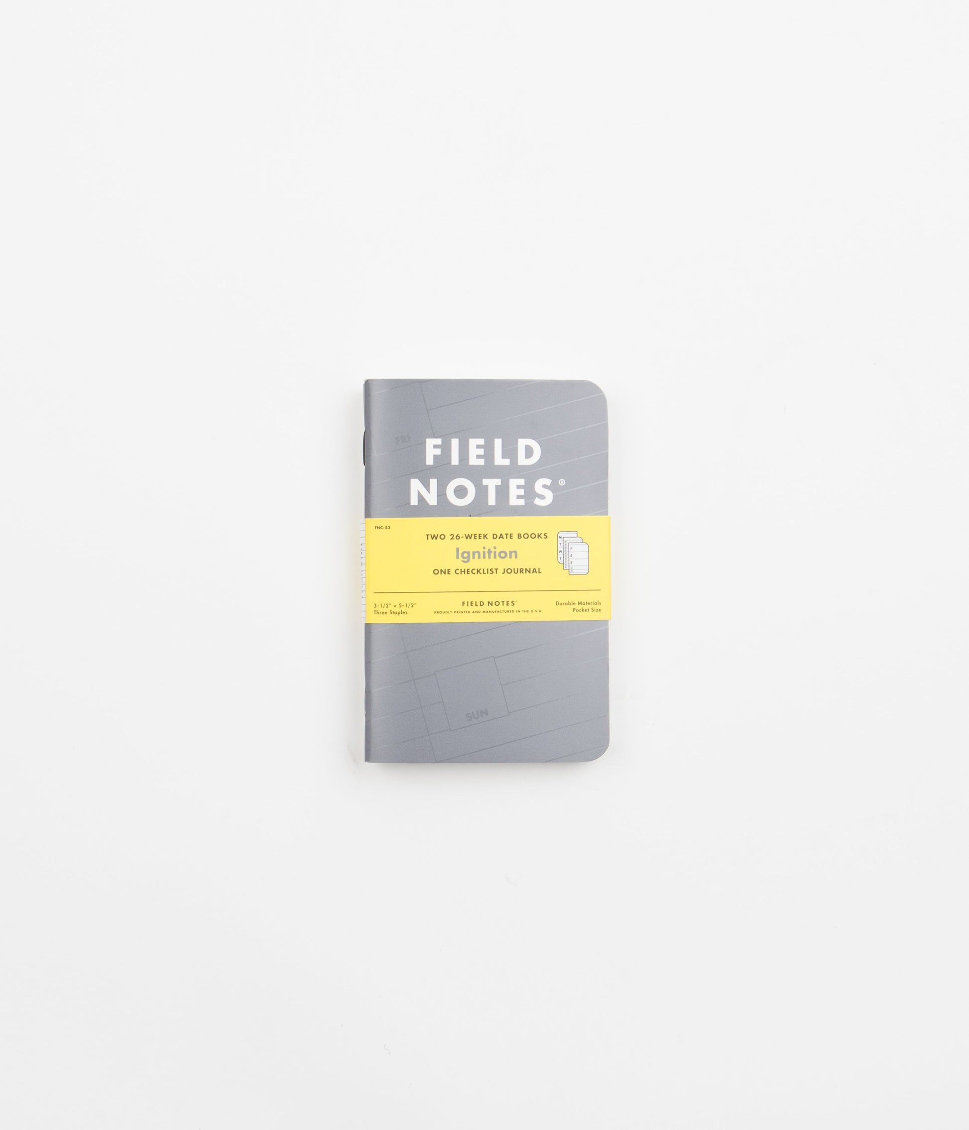 Field Notes Ignition Date & Journal Memo Books 3 Pack in Mixed Paper. Featuring two 26-week planners and a 56-page checklist journal, this three pack of Field Notes memo books is inspired by the brand’s original Field Notes Planner. Crafted in the USA from synthetic paper to feature waterproof and tearproof varnished covers, soy-based Toy ink and rounded corners throughout.