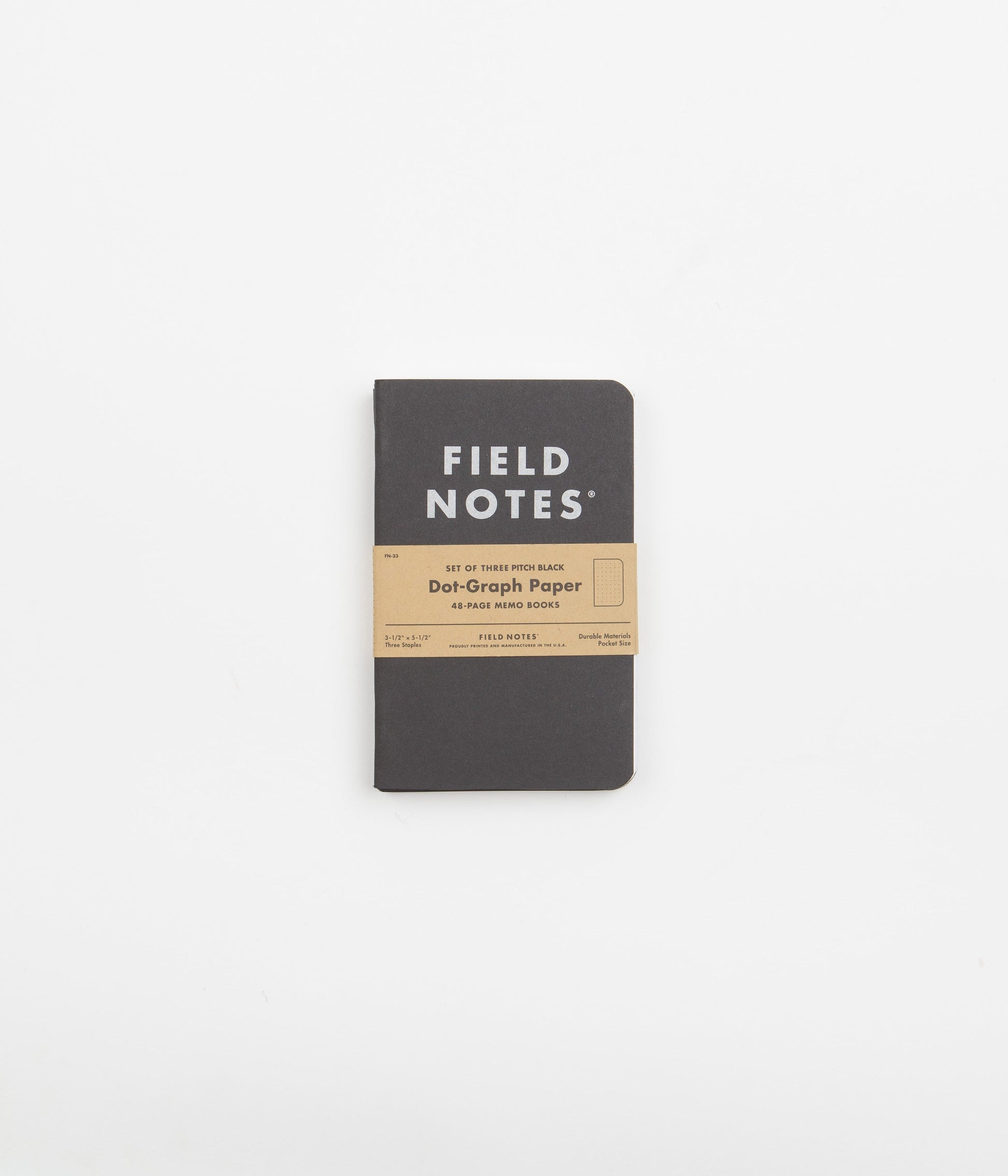 Field Notes Pitch Black Memo Books 3 Pack in Dot Graph Paper. Arriving as part of the brand’s Pitch Black collection with black kraft duplex covers from the French Paper Company, this three pack of Field Notes memo books has been crafted in the US. Each featuring 48-pages of dot-graph paper, these versatile Field Notes memo books are finished with rounded corners and soy-based Saphira ink branding across each cover.