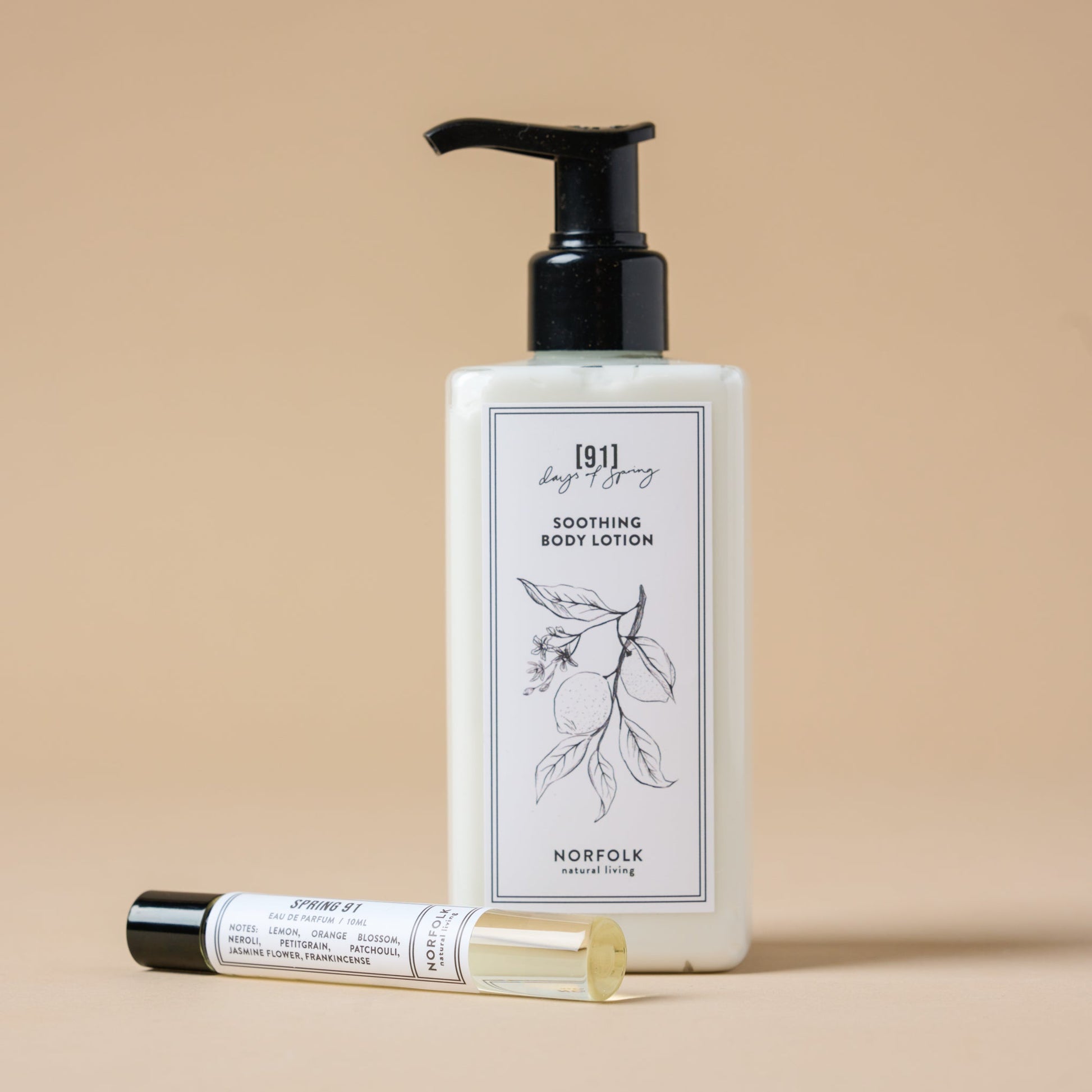 Layer up on savored scents with the Norfolk Natural Living Fine Fragrance Body Care Gift Set. This set includes a travel-sized Eau De Parfum and fragrant Soothing Body Lotion—each scented with the well-loved 91 Days of Spring scent infused with citrus, jasmine, and frankincense essential oils.