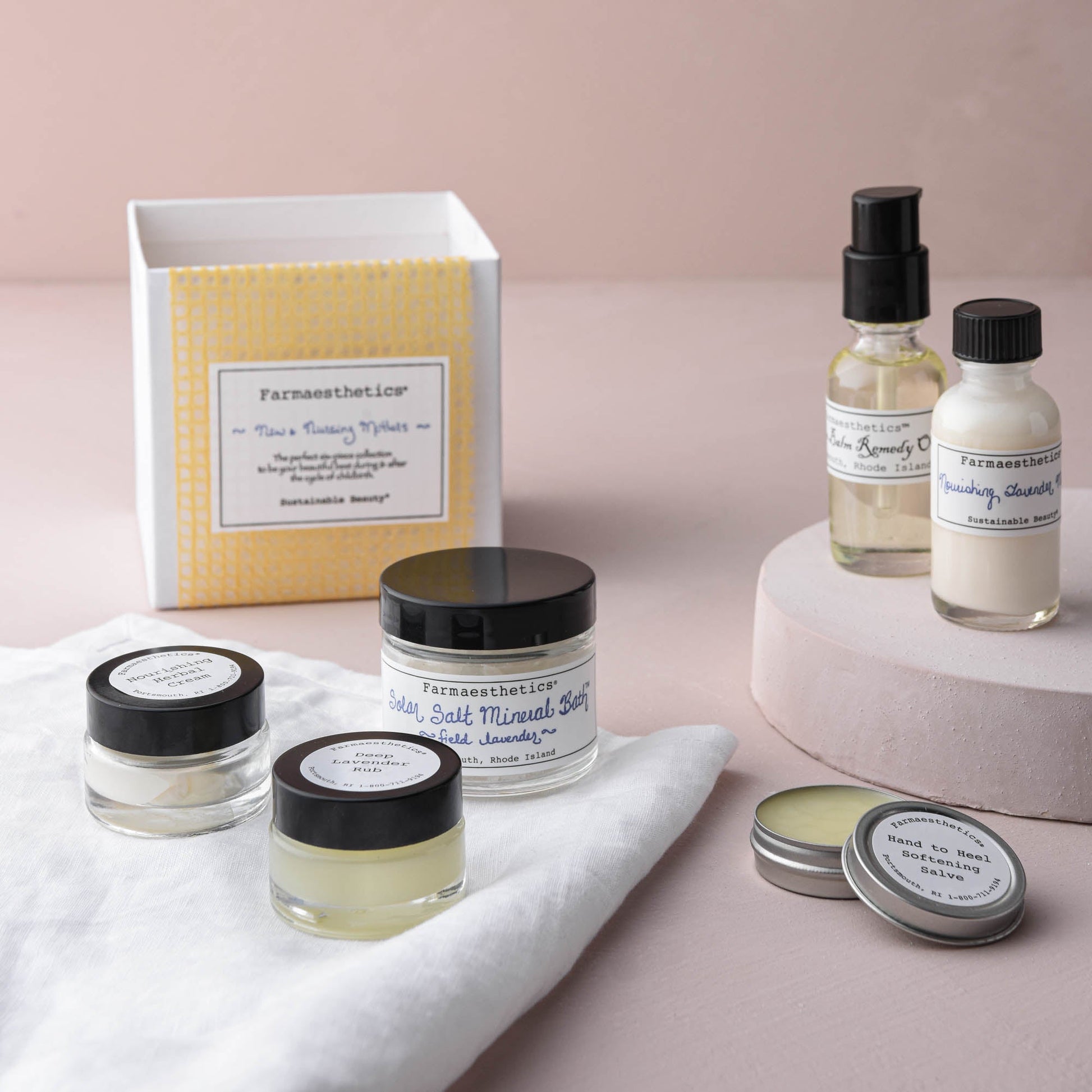 Support the total skin health of face, belly, chest, and body during and after childbirth with the New and Nursing Mothers Set. Made using fresh, natural products from American family farms, this set safely helps heal, soothe, and protect skin and muscles without harmful ingredients. This set arrives in a white linen box wrapped in handmade artisan paper and includes:
