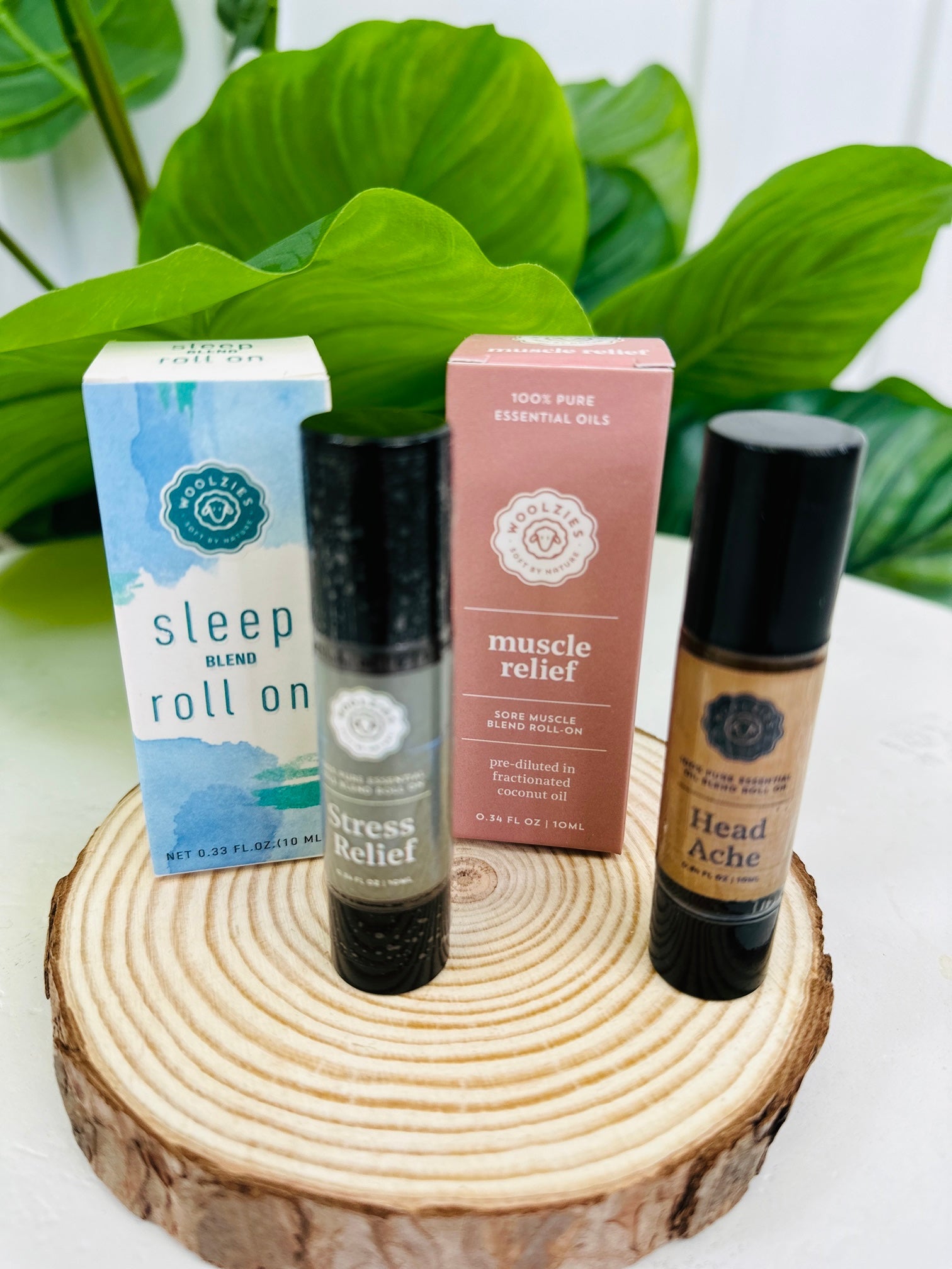 Sleep: Woolzies Sleep Blend helps to relax the mind and body and relieve insomnia. It has an earthy floral aroma and is a combination of lavender, chamomile, orange, copaiba, sandalwood, white lotus, vetiver, blue tansy, patchouli, ylang-ylang, bergamot oils and diluted with fractionated coconut oil. The roll-on feature and compact size make it spillproof, travel-friendly and airline-approved. Sleep Roll-On can be inhaled, diffused and applied topically.