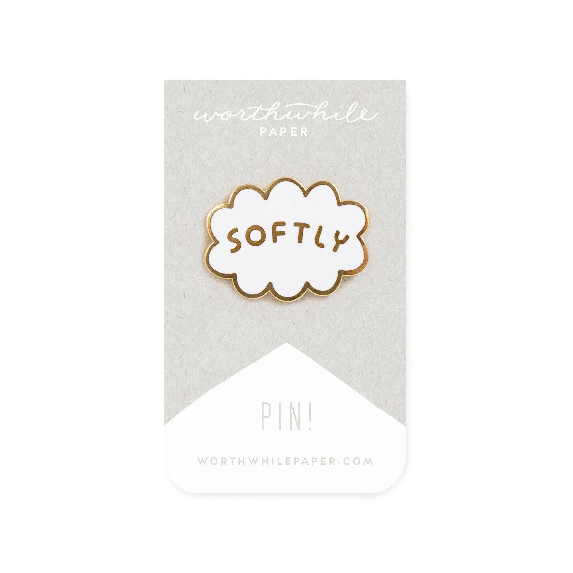 A little cloud that reminds us to be soft. This unique enamel pin is ready for you to adorn your favorite jacket or bag and also makes a perfect little gift for a friend. Size: 1.35 inch Type: Hard Enamel Cloisonné Enamel colors: white Metal color: Polished gold Black rubber backing Worthwhile Paper logo engraved on back